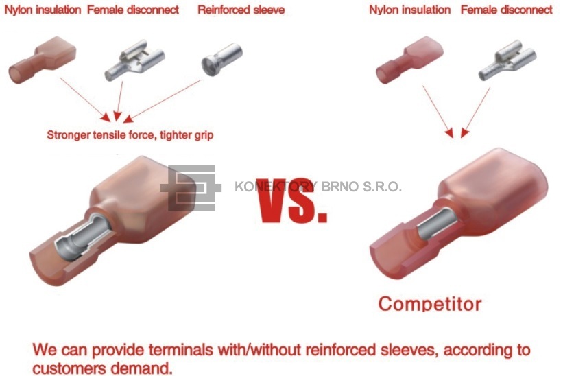 Spojka na lanko izolovaná sériová do průřezu 2.5mm2. Spojka je v provedení "Double crimp" s Cu kroužkem pro uchycení izolace vodiče. Provedení je odolné vůči mechanickému namáhání.