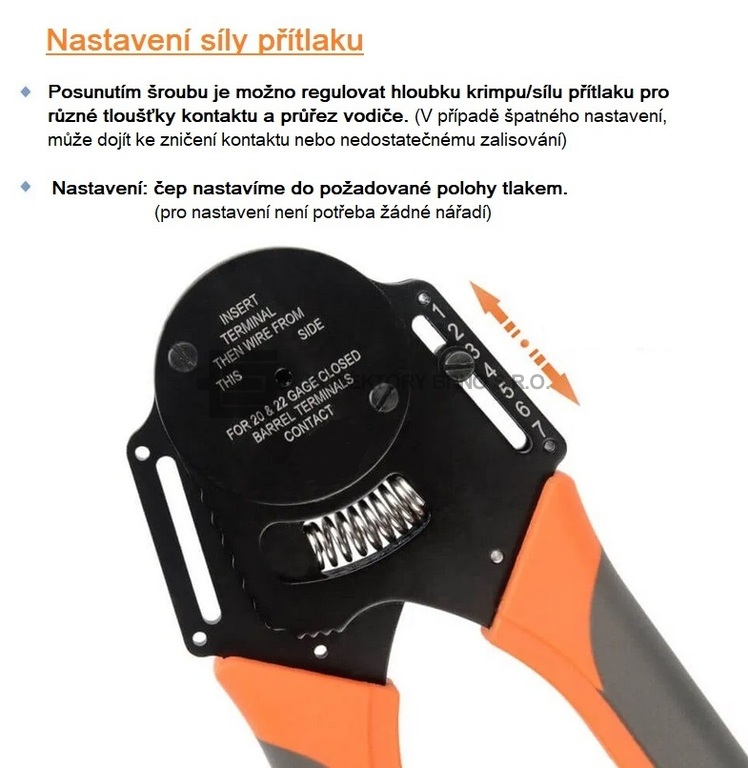 Kleště na soustružené kontakty typu Harting, Ilme. Aretace proti předčasnému uvolnění tlaku.