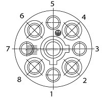 Kruhový konektor C 16-3 s kolíčky, rovný. Počet kontaktů 8 + PE, 400 V, 12 A, odlehčovací spona kabelu, kontakty krimpovací (kontakty nejsou součástí)