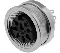 T 3507 000: Kruhový pokovený konektor C 091s dutinkami, panelový s přední montáží. Počet kontaktů 8, 100 V, kontakty letovací
