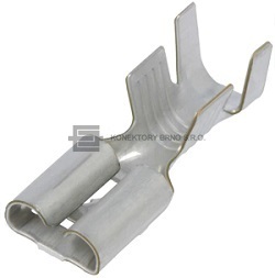 Plochá dutinka 6.3x0.8mm se zpětným zobáčkem pro uchycení v krytu. Provedení předrolované pro snazší lisování.