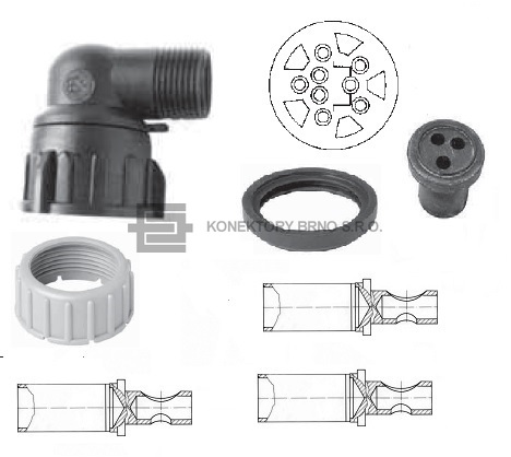 Sestava kruhového konektoru Schlemmer 3p s bajonetem 16S. Dutinka je na kolíček o průměru 4 mm