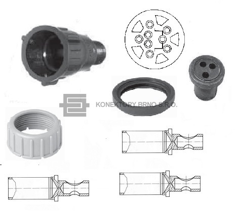 Sestava kruhového konektoru Schlemmer 3p s bajonetem 16S. Dutinka je na kolíček o průměru 4 mm
